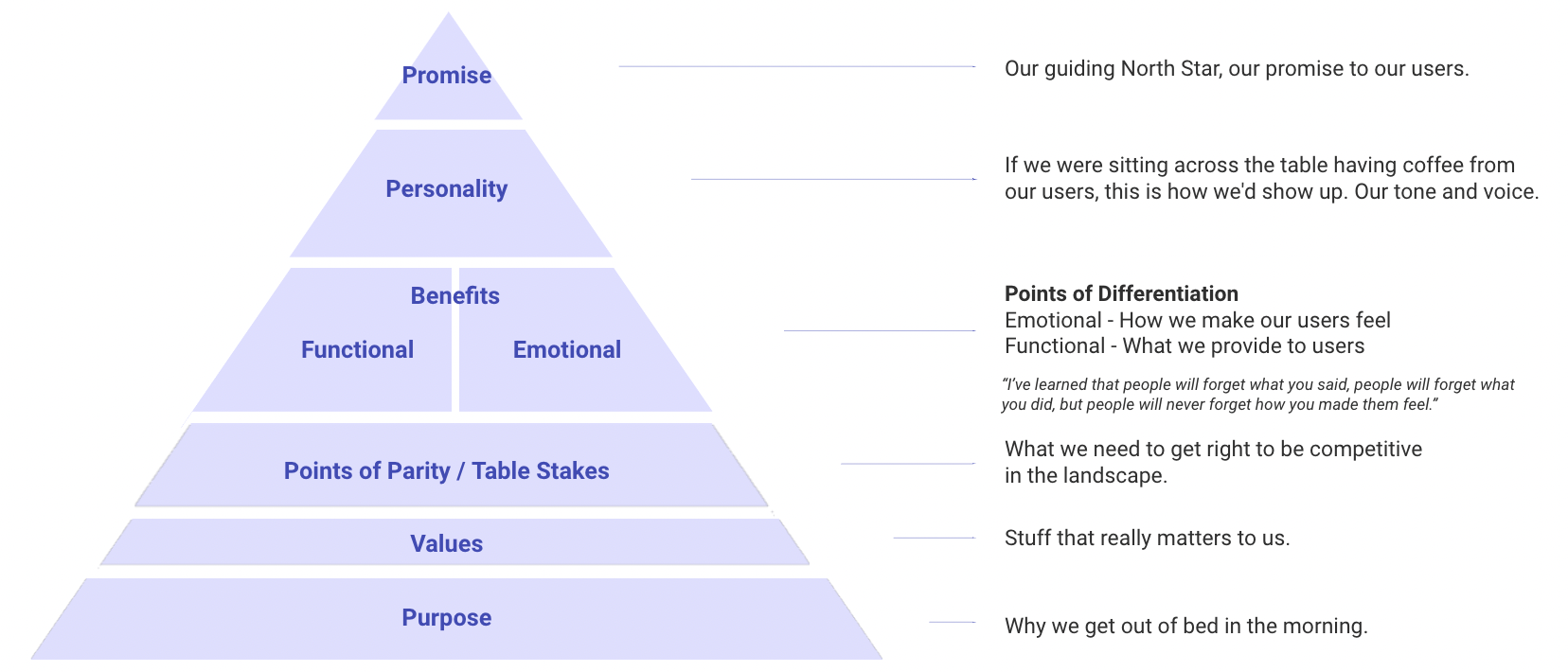 Post workshop, the ideas from the group are shaped into the layers of the brand pyramid, a document that makes it easy for anyone in the company to understand the fundamental principles of the brand.