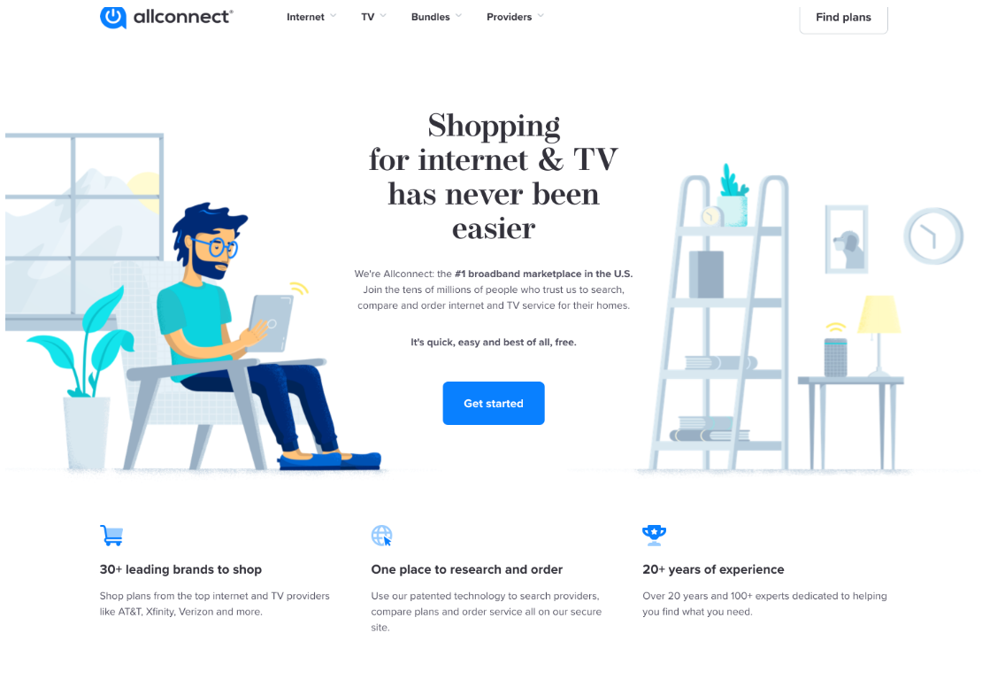 The overall strategy for redesigning the hero is mirrored on the remainder of the home page. Each value section was crafted to be user-centric, with a focus on trust and convenience. The language “marketplace” helps the user frame Allconnect as a resource for comparison. User test findings indicated that users were still not sure that Allconnect is not, itself, a service provider, but a resource for comparing providers. To further explain how Allconnect as a marketplace, there’s a focus on convenience language of saving time on comparison, saving money with comparison, and having multiple ways to shop, all with expert guidance. The benefit of using Allconnect over researching alone is made more visual with a comparison chart and a friendly-face expert positioned above the article curation section.